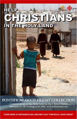 Each Good Friday, the Collection is taken up in Catholic Churches around the world to support the work of the Franciscans of the Custody of the Holy Land. Christians there rely heavily on the assistance that comes to them from this Collection. The Franciscans of the Custody have the unique responsibility to care for the Holy Places as well the Christians there, known as the "Living Stones" of our faith. Supporting this collection helps maintain a Christian presence in the very land made holy by the life, death and resurrection of Jesus Christ.